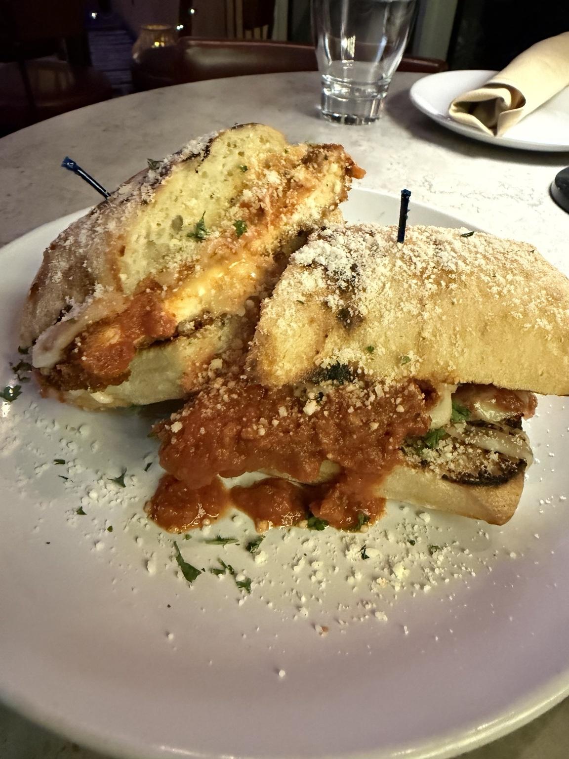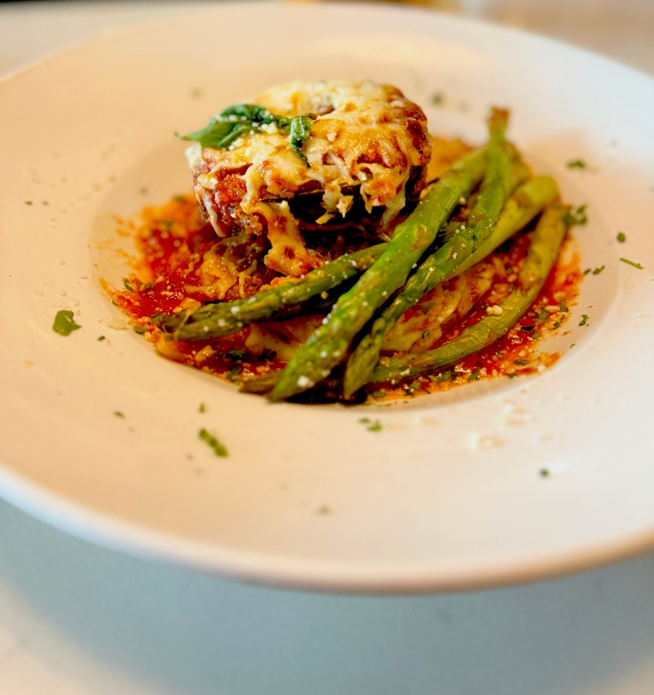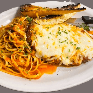 breaded to order, crispy and savory chicken breast, marinara sauce, creamy melted mozzarella cheese, linguini, garlic bread