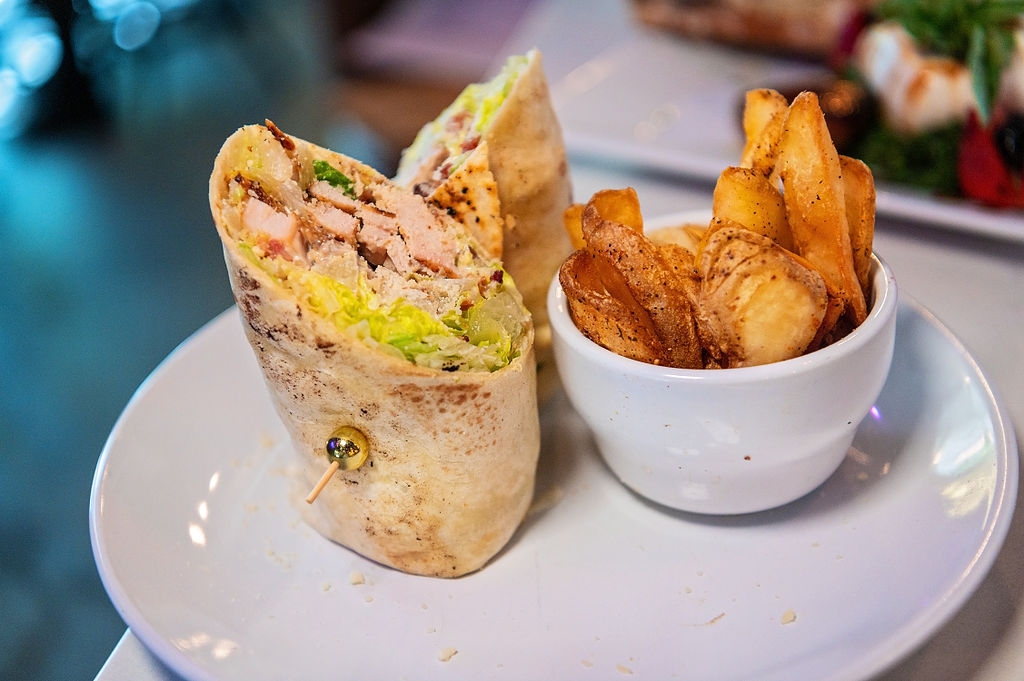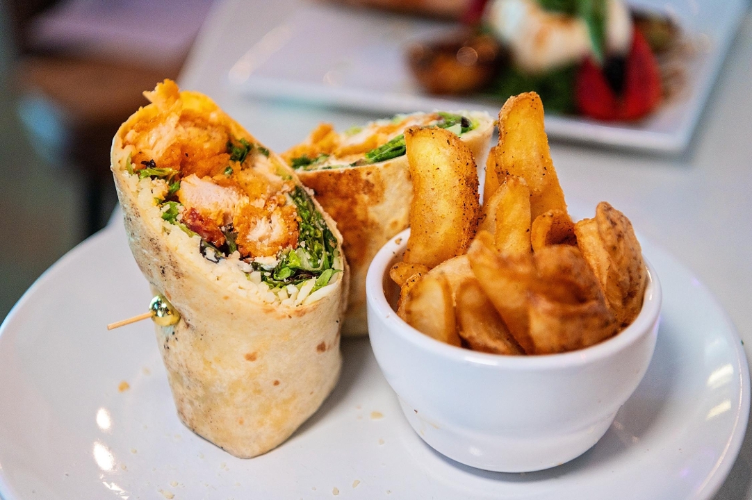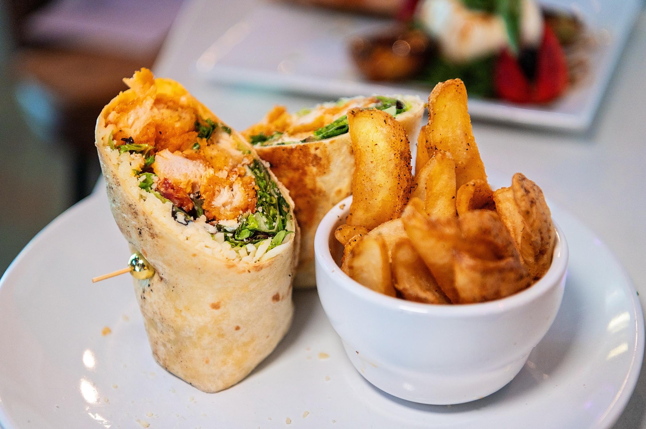 Includes seasoned fries. Crispy chicken, spring mix, bacon, ranch dressing, bleu cheese crumbles, and mozzarella wrapped in a flour tortilla