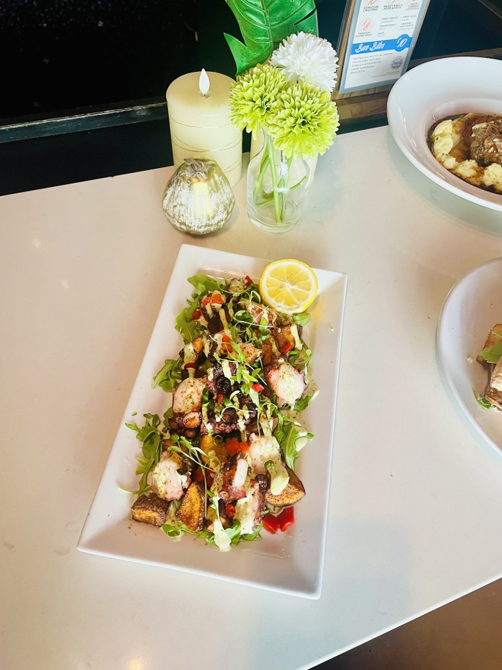 Charred octopus, crispy potatoes, cilantro aioli, arugula