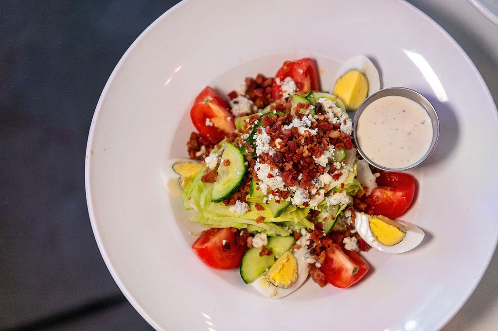 Bib lettuce, bacon, tomatoes, hard-boiled egg, cucumber, bleu cheese crumbles, ranch