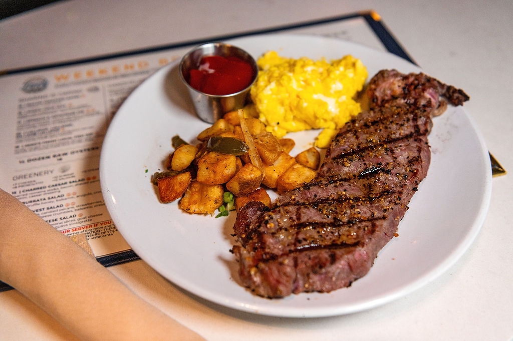 12 oz grilled strip steak, two eggs your way, home fries