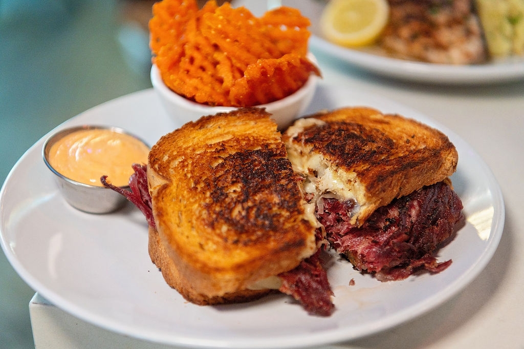Grilled corned beef, swiss, sauerkraut, grilled rye bread, thousand island, whole grain mustard