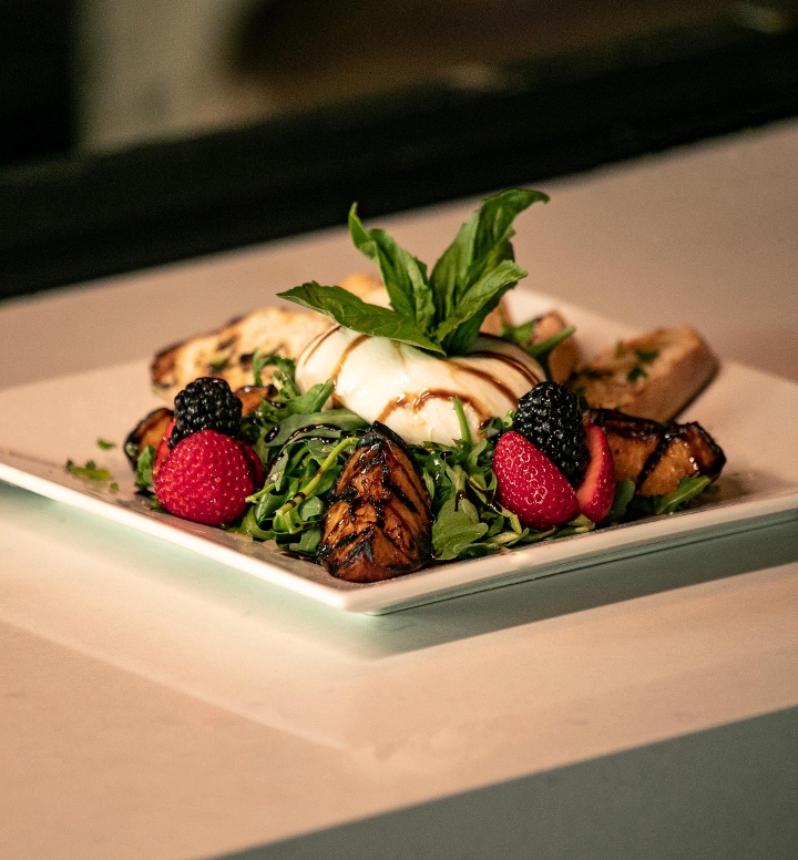 Grilled peaches, berries, arugula, truffle honey, balsamic glaze, crostini