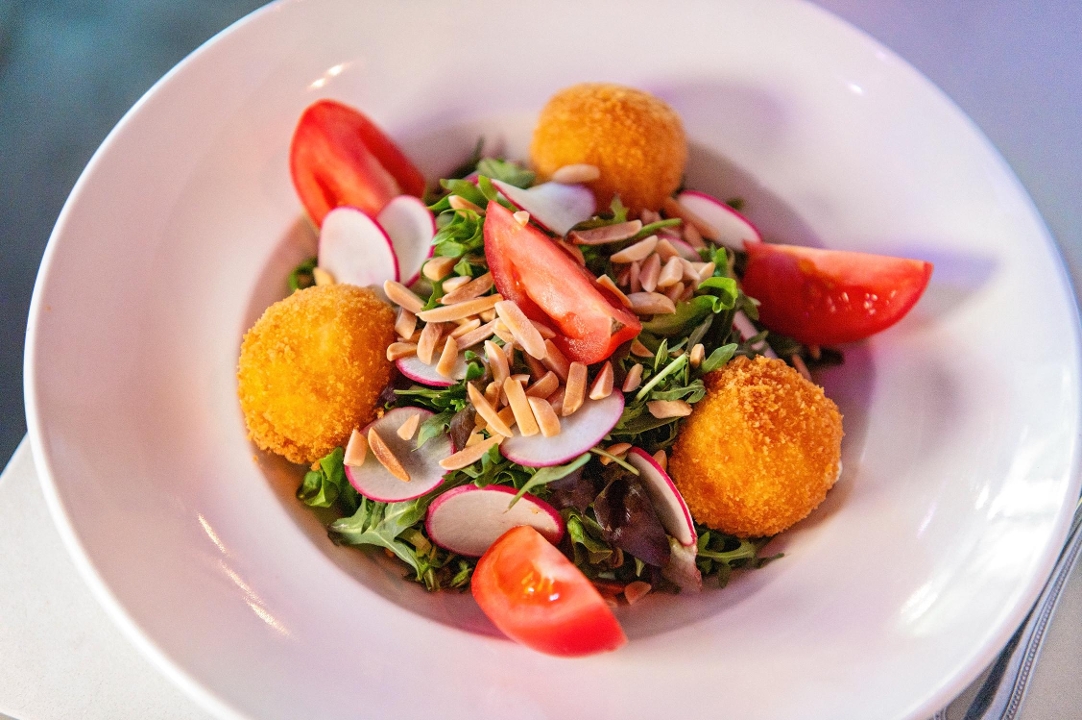 Arugula, craisins, almond slices, goat cheese croquettes, radishes, guava vinaigrette