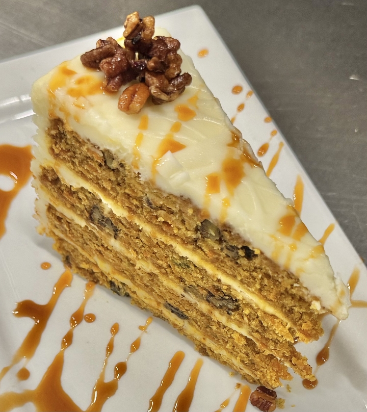 Moist carrot cake, raisins, walnuts, pineapple, cream cheese icing, white chocolate ganache, caramel
