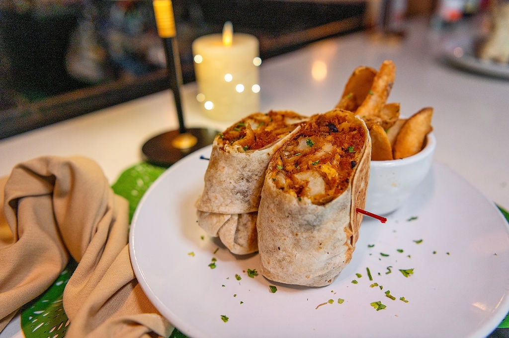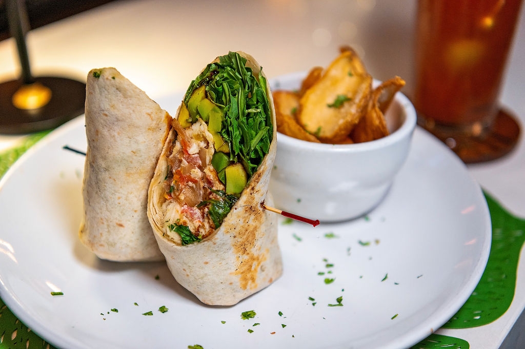 Includes seasoned fries. Egg whites, arugula, tomato, grilled onions, avocado, flour wrap