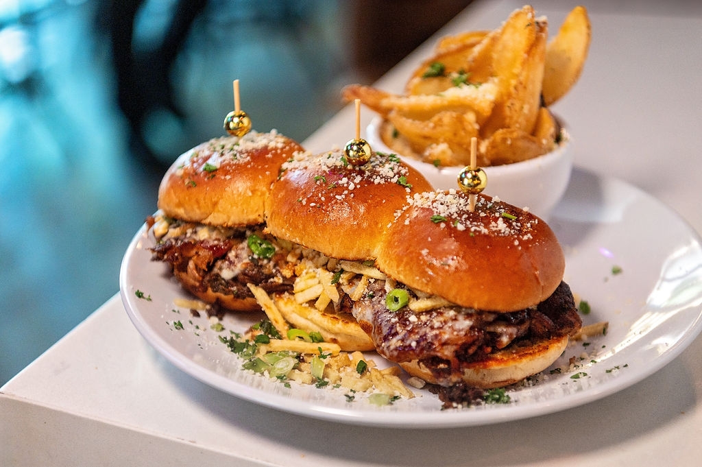 Pulled pork, chorizo, grilled onions, mozzarella cheese, potato sticks, BBQ sauce, Hawaiian rolls