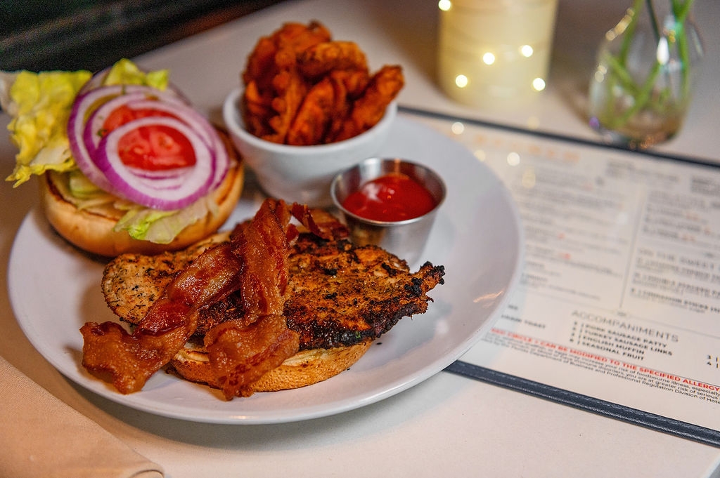 Includes seasoned fries. Blackened chicken, bacon, lettuce, tomato, onion, brioche bun
