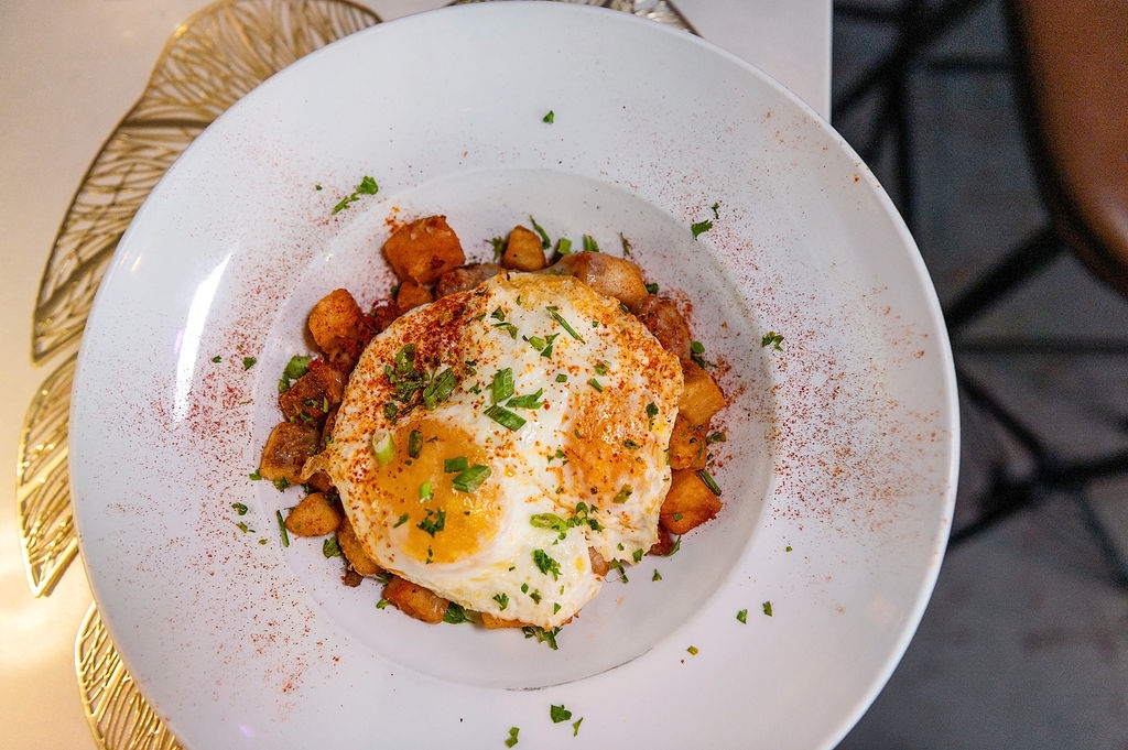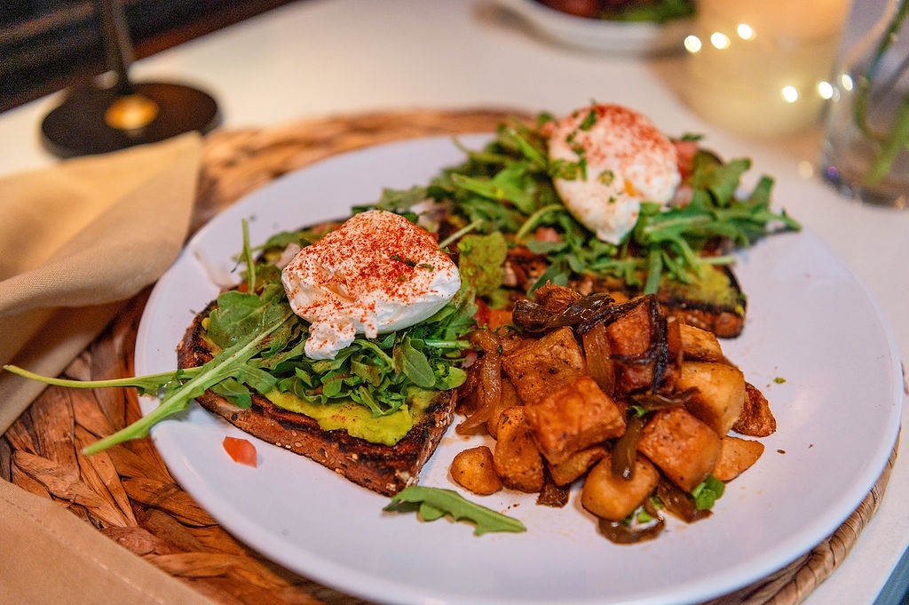 Avocado spread, arugula, tomatoes, poached egg, whole grain toast, home fries