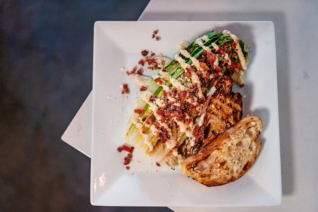 Charred romaine stalks, bacon, shaved parmesan, crostini, Caesar dressing