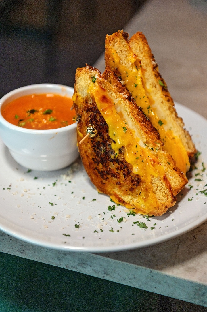 Three-cheese mix (American, cheddar, mozzarella), garlic challah bread