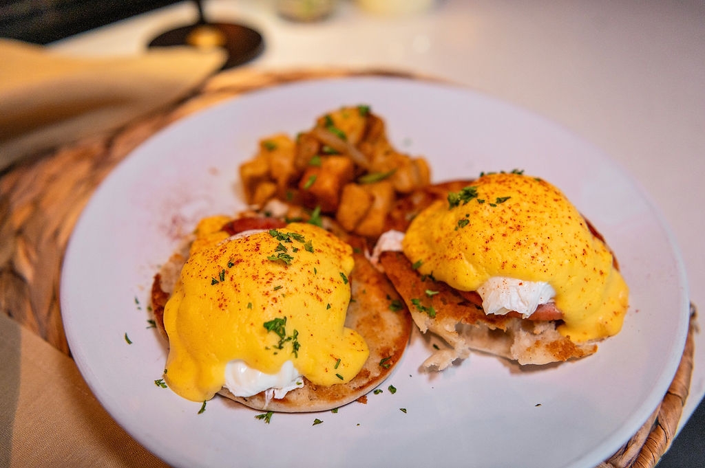 Two poached eggs, Canadian bacon, English muffin, hollandaise, home fries