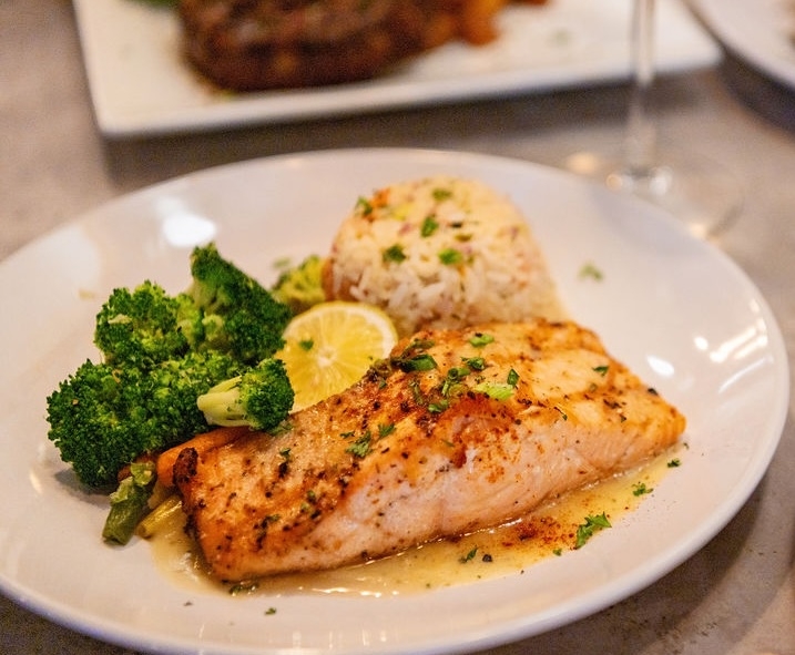 Salmon fileted in house, lemon wine reduction sauce, seasoned rice and vegetable medley