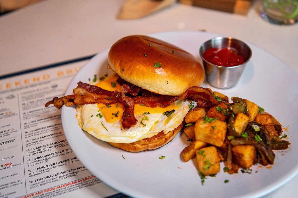 Includes seasoned fries. Two eggs your way, American cheese, bacon, brioche bun