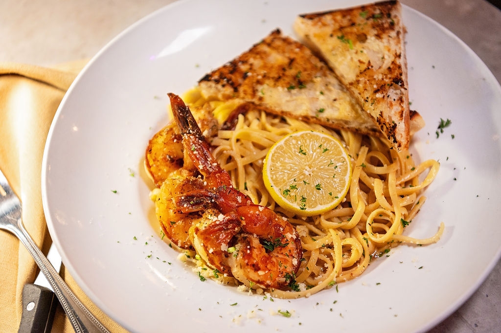 Tiger shrimp and linguini, lemon, butter, white wine sauce, garlic bread