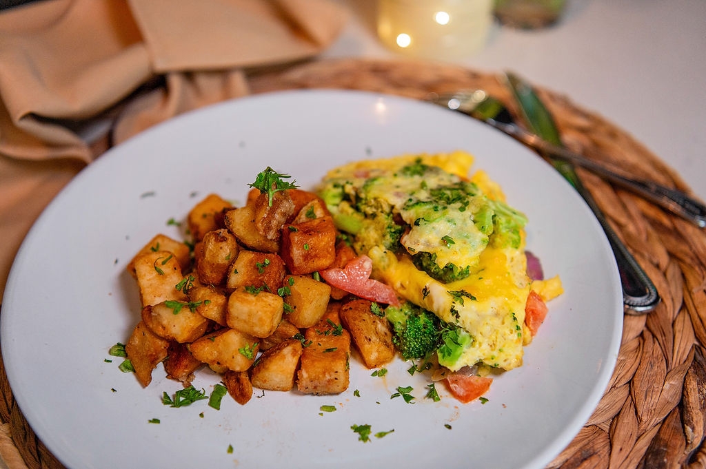 Includes home fries. Onion, bell pepper, tomato, broccoli