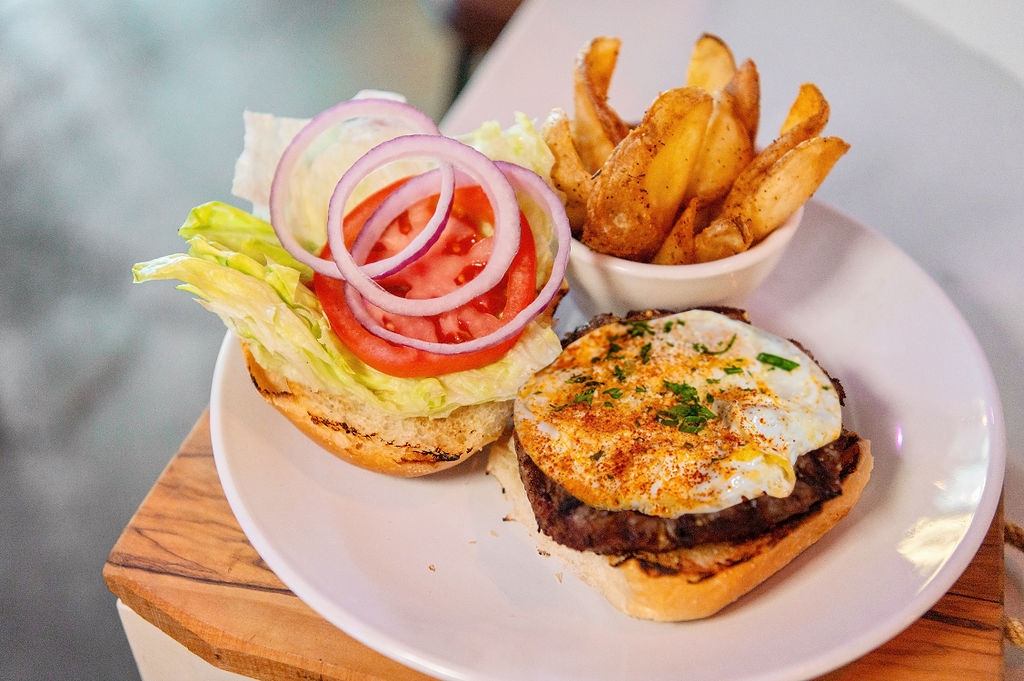 Includes seasoned fries. Egg your way, angus prime beef, American cheese, lettuce, tomato, red onion, brioche bun