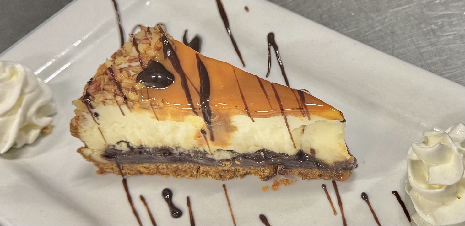 New York style turtle cheesecake, fudge, Caramel, chopped pecans, whipped cream