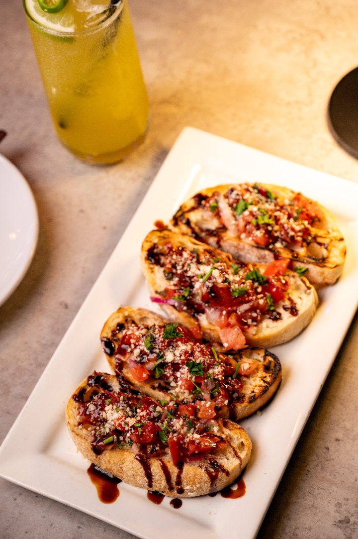 Parmesan, balsamic glaze drizzle, crostini